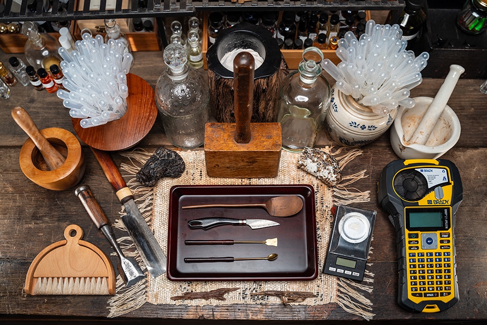Over the years, his practice has been shaped not only by formulation, but by long hours spent observing materials, refining compositions, learning how scent behaves over time, and traveling abroad in search of aromatic wisdom, traditional understanding, and to initiate collaborative distillation projects.